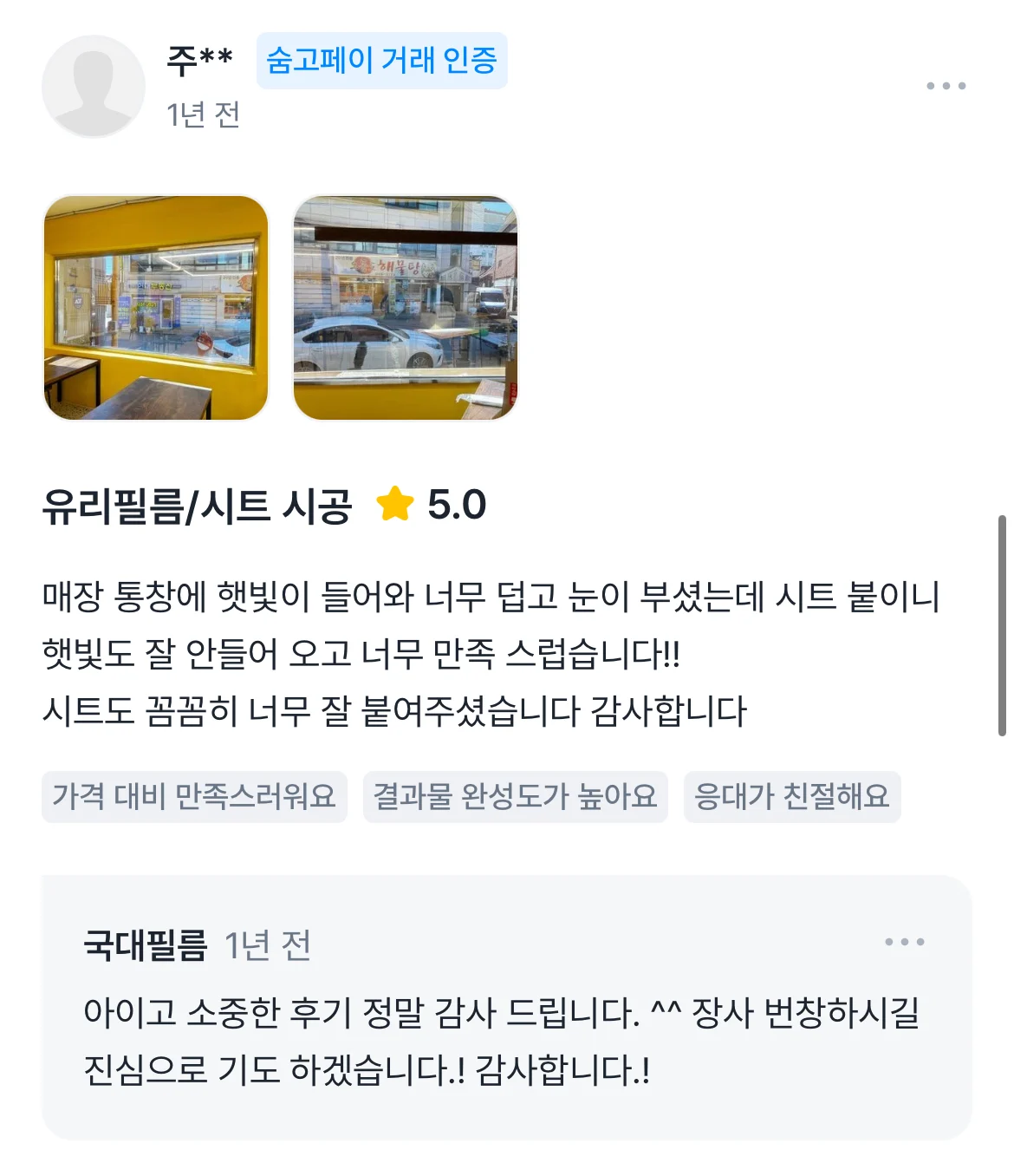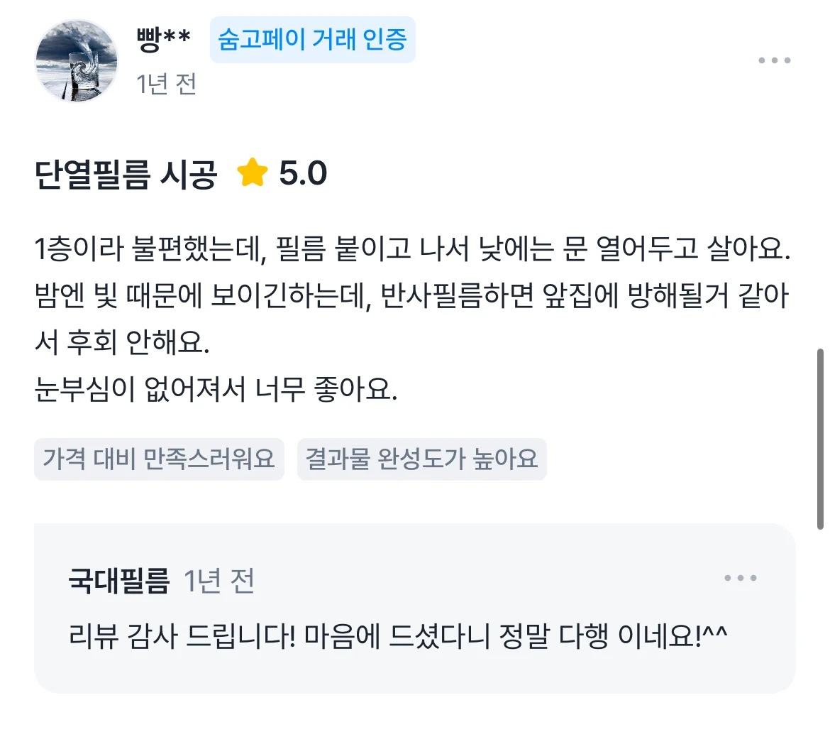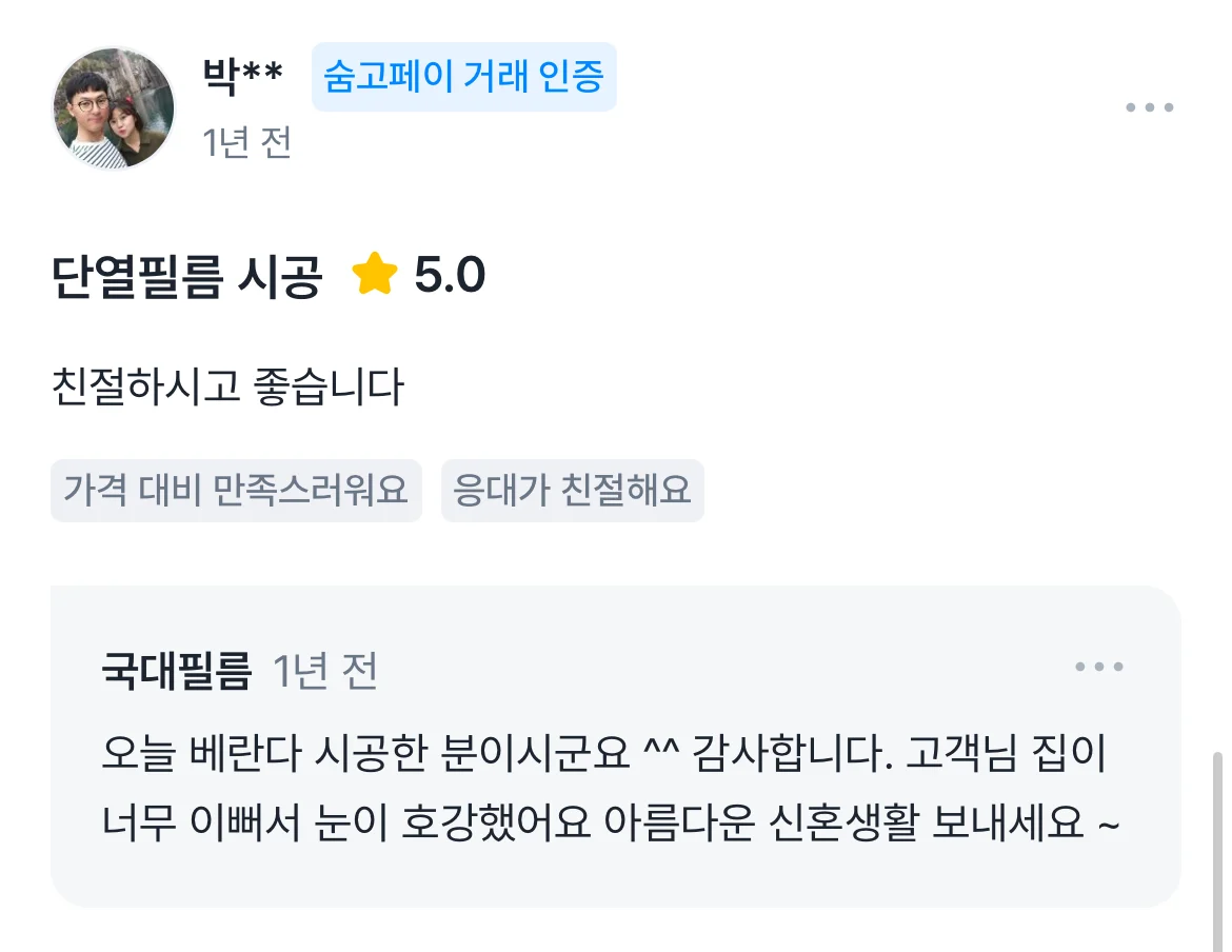 숨고에 남겨주신 고객님의 소중한 리뷰 입니다